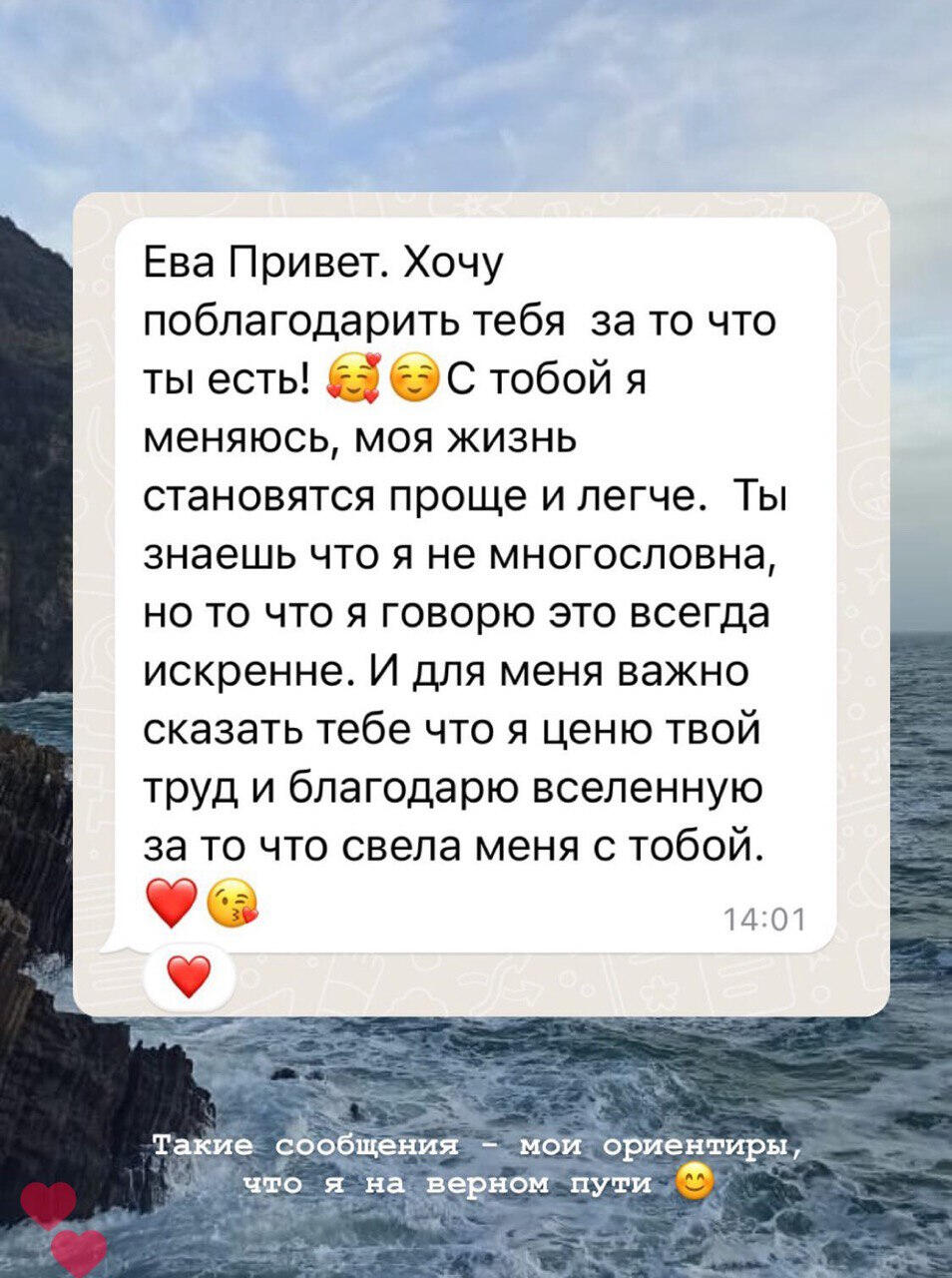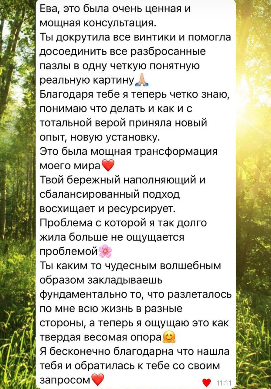 Меня зовут Ева, я — украинский психолог и тета-практик, с опытом консультирования более трёх лет.Работаю в интегративном подходе — это научное и практическое направление в психологии, которое объединяет лучшие методы психологической помощи разных времен и народов и в результате создает свой универсальный подход. Этот подход ведёт человека к целостности, единству с миром и самим собой, гармоничной полноценной жизни и успешной самореализации.Как психолог онлайн предоставляю консультации, ориентируясь на индивидуальные потребности и уникальность каждого человека. Я использую инструменты Когнитивно-Поведенческой Терапии(КПТ), Эмоционально-Образной Терапии(ЭОТ), Трансактного Анализа(ТЗ) и Тета-Хилинга.Моя помощь доступна для жителей Украины, а также для любой точки мира, поэтому ваше местоположение не имеет значения.